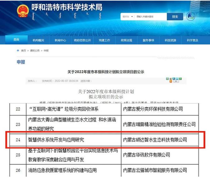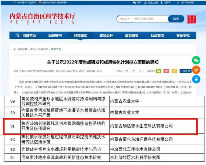 碩達(dá)智水作為水生態(tài)領(lǐng)域高新技術(shù)企業(yè),科研創(chuàng)新是企業(yè)發(fā)展第一驅(qū)動(dòng)力,公司水生態(tài)研究院一直專(zhuān)注于新技術(shù)、新產(chǎn)品的研究探索。近期,內(nèi)蒙古自治區(qū)科學(xué)技術(shù)廳發(fā)布“關(guān)于公示2022年度重點(diǎn)研發(fā)和成果轉(zhuǎn)化計(jì)劃擬立項(xiàng)目的通知”,與呼和浩特市科學(xué)技術(shù)局發(fā)布“關(guān)于2022年度市本級(jí)科技計(jì)劃擬立項(xiàng)項(xiàng)目的公示”碩達(dá)智水兩大科研項(xiàng)目名列其中。